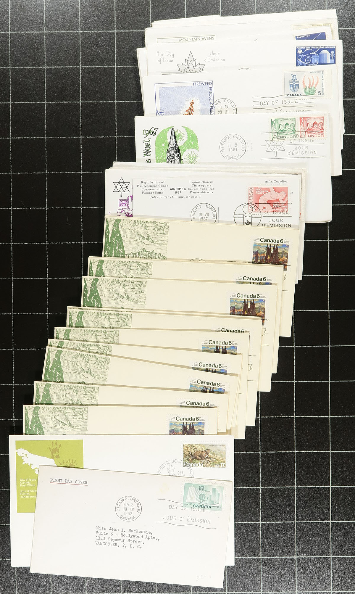 First Day Covers. Accumulation of Canada first day covers, 1950's-1990's, containing many hundreds of covers (roughly 750), noting singles, sets, souvenir sheets, plate blocks, coils, booklets, and a few high denomination frankings. The lot also contains a few oversized covers, notably with "Art" plate blocks, along with private cachet and uncacheted covers from the 1950's onwards, and some post office announcements. Duplication from 3 to 5 possible for some issues. A nice lot for the collector or dealer looking to fill up dollar boxes, overall fine to very fine. Estimate =