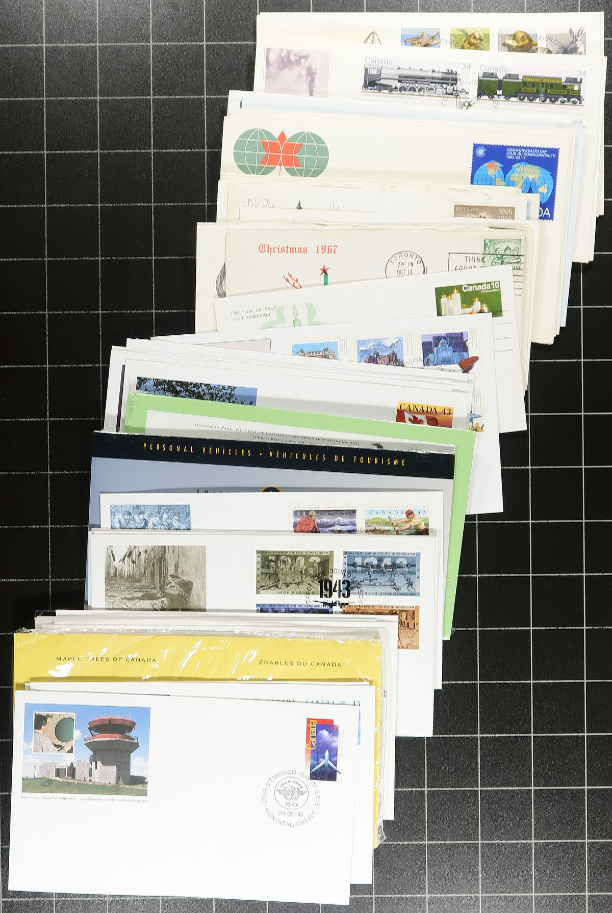 First Day Covers. Accumulation of Canada first day covers, 1950's-1990's, containing many hundreds of covers (roughly 750), noting singles, sets, souvenir sheets, plate blocks, coils, booklets, and a few high denomination frankings. The lot also contains a few oversized covers, notably with "Art" plate blocks, along with private cachet and uncacheted covers from the 1950's onwards, and some post office announcements. Duplication from 3 to 5 possible for some issues. A nice lot for the collector or dealer looking to fill up dollar boxes, overall fine to very fine. Estimate =