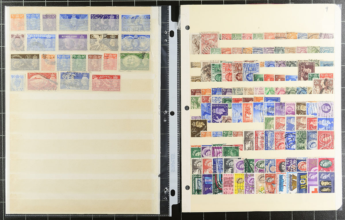 Collection / accumulation of used Great Britain, 1857-1990's, containing over 1,000 stamps in over 20 stock or album pages, and a stockbook. The lot generally ranges from Scott #26/1448, including a small selection of Victorian issues including #s 26, 27, 27a, 28, 39, 43, 45, 48, along with a selection of Penny Reds on pages collected for plate numbers, several used blocks, and much more. A spot check of catalogue values indicated some stamps ranging from $15 to $40 and up each. A potentially high cataloguing lot, along with some faults with a few of the early issues, overall fine to very fine. Estimate =