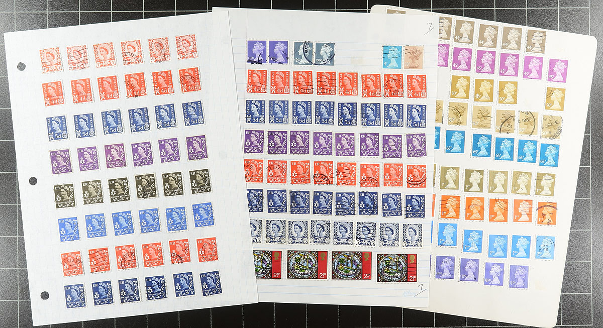 Collection / accumulation of used Great Britain, 1857-1990's, containing over 1,000 stamps in over 20 stock or album pages, and a stockbook. The lot generally ranges from Scott #26/1448, including a small selection of Victorian issues including #s 26, 27, 27a, 28, 39, 43, 45, 48, along with a selection of Penny Reds on pages collected for plate numbers, several used blocks, and much more. A spot check of catalogue values indicated some stamps ranging from $15 to $40 and up each. A potentially high cataloguing lot, along with some faults with a few of the early issues, overall fine to very fine. Estimate =