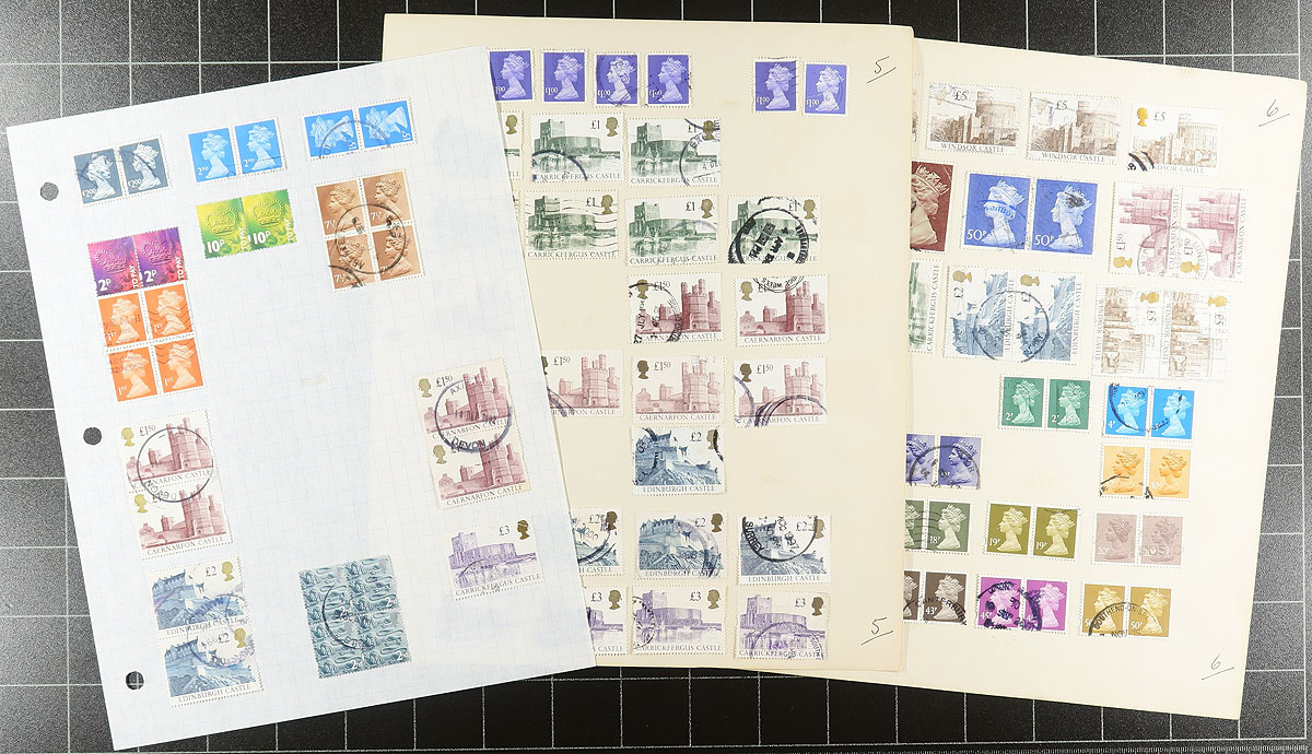 Collection / accumulation of used Great Britain, 1857-1990's, containing over 1,000 stamps in over 20 stock or album pages, and a stockbook. The lot generally ranges from Scott #26/1448, including a small selection of Victorian issues including #s 26, 27, 27a, 28, 39, 43, 45, 48, along with a selection of Penny Reds on pages collected for plate numbers, several used blocks, and much more. A spot check of catalogue values indicated some stamps ranging from $15 to $40 and up each. A potentially high cataloguing lot, along with some faults with a few of the early issues, overall fine to very fine. Estimate =