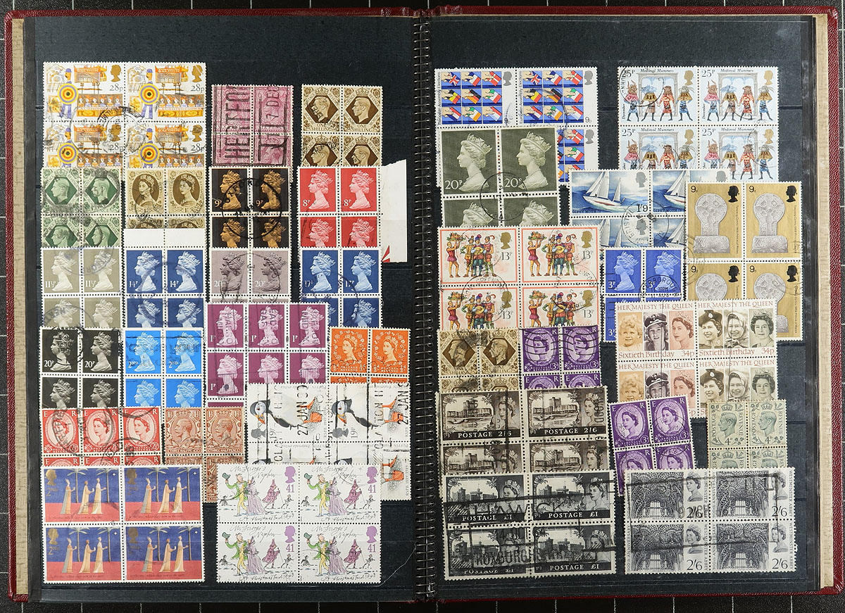 Collection / accumulation of used Great Britain, 1857-1990's, containing over 1,000 stamps in over 20 stock or album pages, and a stockbook. The lot generally ranges from Scott #26/1448, including a small selection of Victorian issues including #s 26, 27, 27a, 28, 39, 43, 45, 48, along with a selection of Penny Reds on pages collected for plate numbers, several used blocks, and much more. A spot check of catalogue values indicated some stamps ranging from $15 to $40 and up each. A potentially high cataloguing lot, along with some faults with a few of the early issues, overall fine to very fine. Estimate =