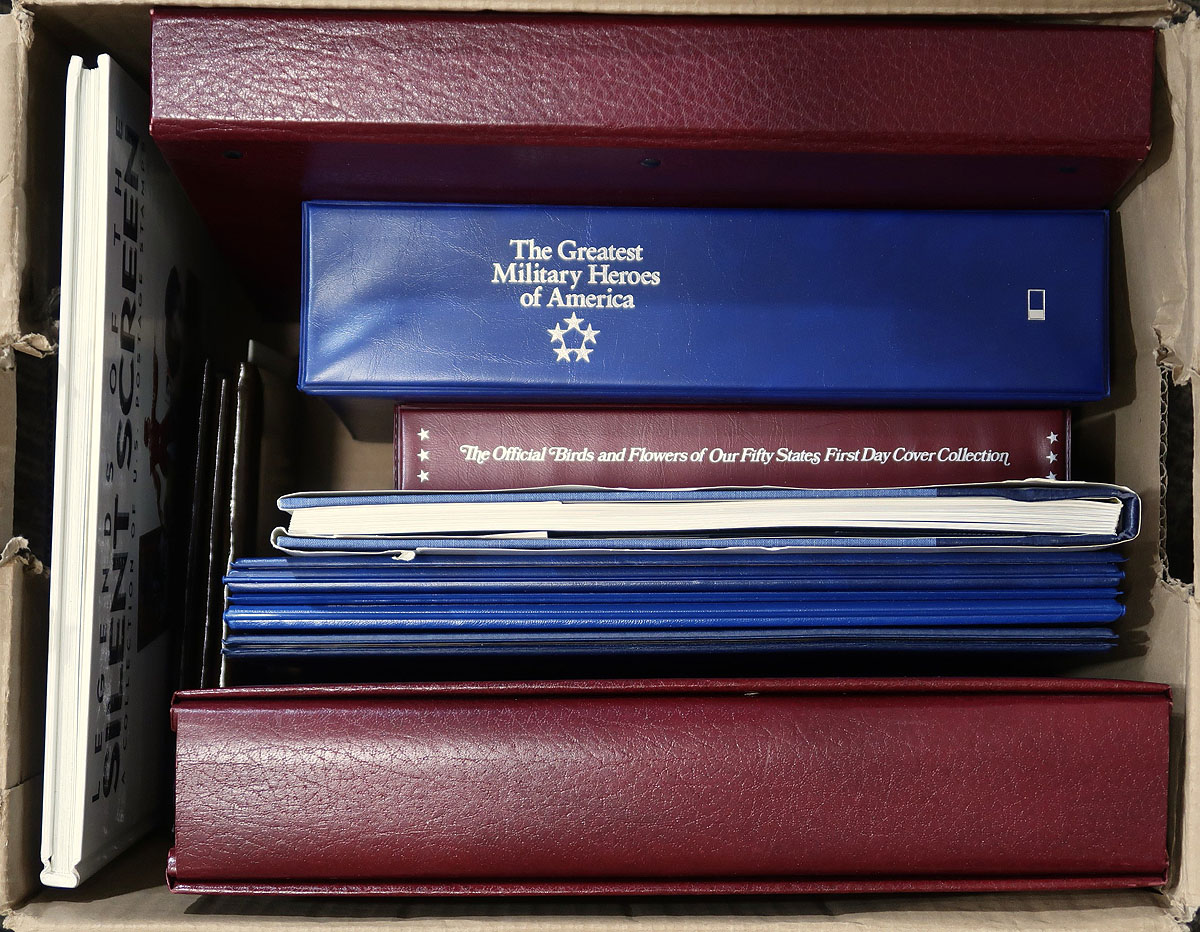 Carton full of United States Topical collections, containing 8 cover or stamp collections including: The Official Seals of the Thirteen Original Colonies of the United States of America (minted in 23 karat gold foil stamps), The Official Birds and Flowers of Our Fifty States, The Greatest Military Heroes of America, Reader's Digest First Day Cover Collection, U.S. Commemorative Stamp Collector Panels, and a few more. A nice lot for thematic or topical collector. Estimate =