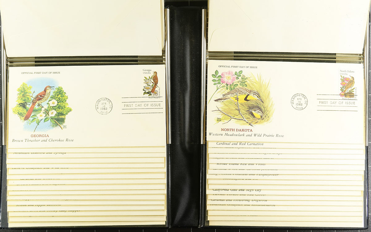 Carton full of United States Topical collections, containing 8 cover or stamp collections including: The Official Seals of the Thirteen Original Colonies of the United States of America (minted in 23 karat gold foil stamps), The Official Birds and Flowers of Our Fifty States, The Greatest Military Heroes of America, Reader's Digest First Day Cover Collection, U.S. Commemorative Stamp Collector Panels, and a few more. A nice lot for thematic or topical collector. Estimate =