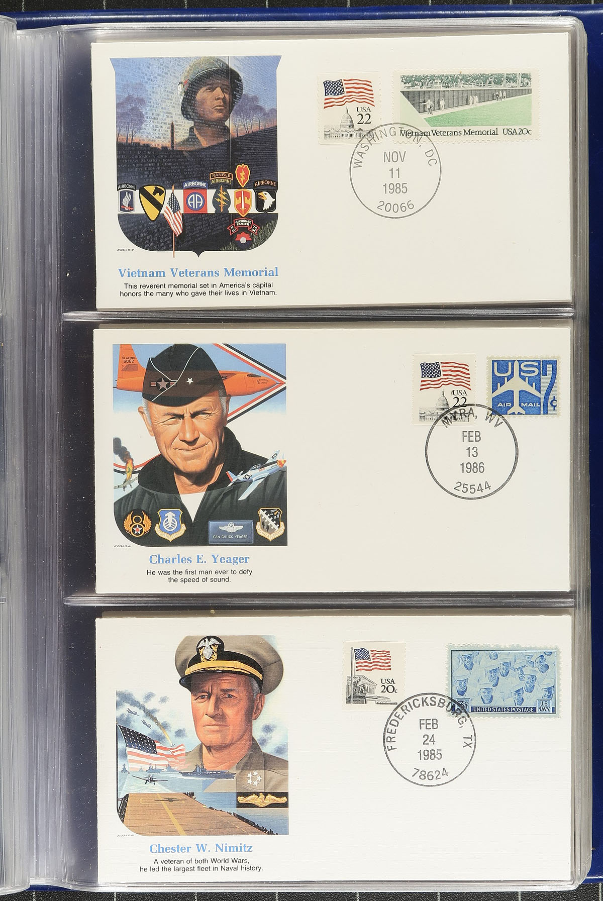 Carton full of United States Topical collections, containing 8 cover or stamp collections including: The Official Seals of the Thirteen Original Colonies of the United States of America (minted in 23 karat gold foil stamps), The Official Birds and Flowers of Our Fifty States, The Greatest Military Heroes of America, Reader's Digest First Day Cover Collection, U.S. Commemorative Stamp Collector Panels, and a few more. A nice lot for thematic or topical collector. Estimate =