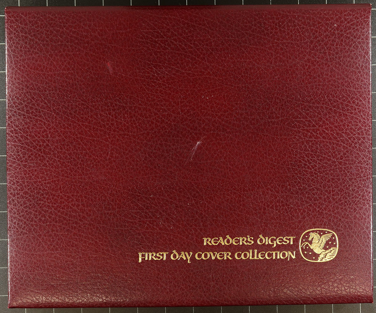 Carton full of United States Topical collections, containing 8 cover or stamp collections including: The Official Seals of the Thirteen Original Colonies of the United States of America (minted in 23 karat gold foil stamps), The Official Birds and Flowers of Our Fifty States, The Greatest Military Heroes of America, Reader's Digest First Day Cover Collection, U.S. Commemorative Stamp Collector Panels, and a few more. A nice lot for thematic or topical collector. Estimate =