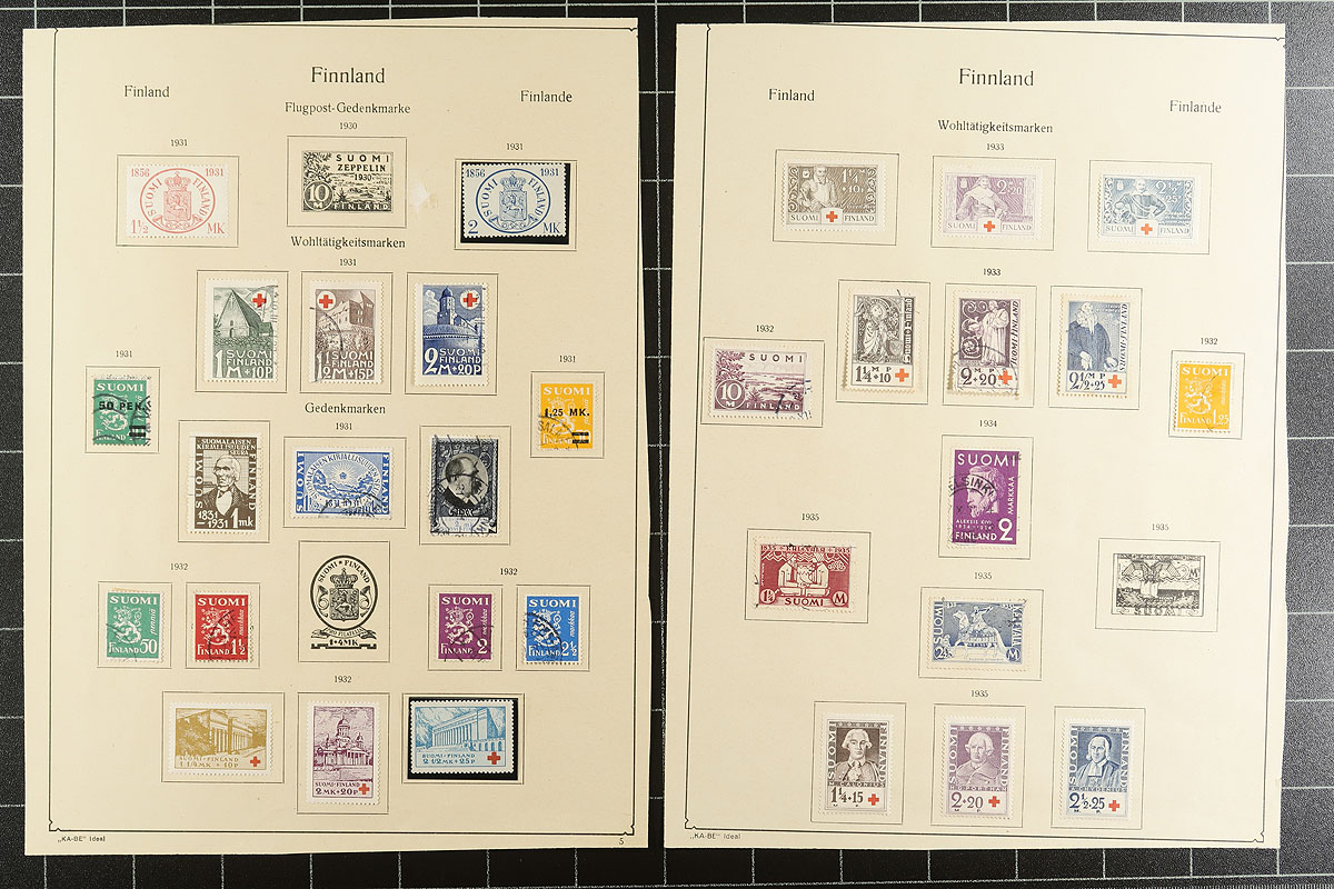 A mounted collection of 178 early Finland on KA-BE "ideal pages" (cut down) up to 1942. Includes a serpentine roulette (#10), a scattering of nicely cancelled "Coat of Arms" issues, some "Vasa" issues, and a nice offering of mostly used semi-postals, including #B2-B4, B5-B7, B12-B14, B24-B30. A great way to enhance your early 20th century Scandinavian collection. Estimate =