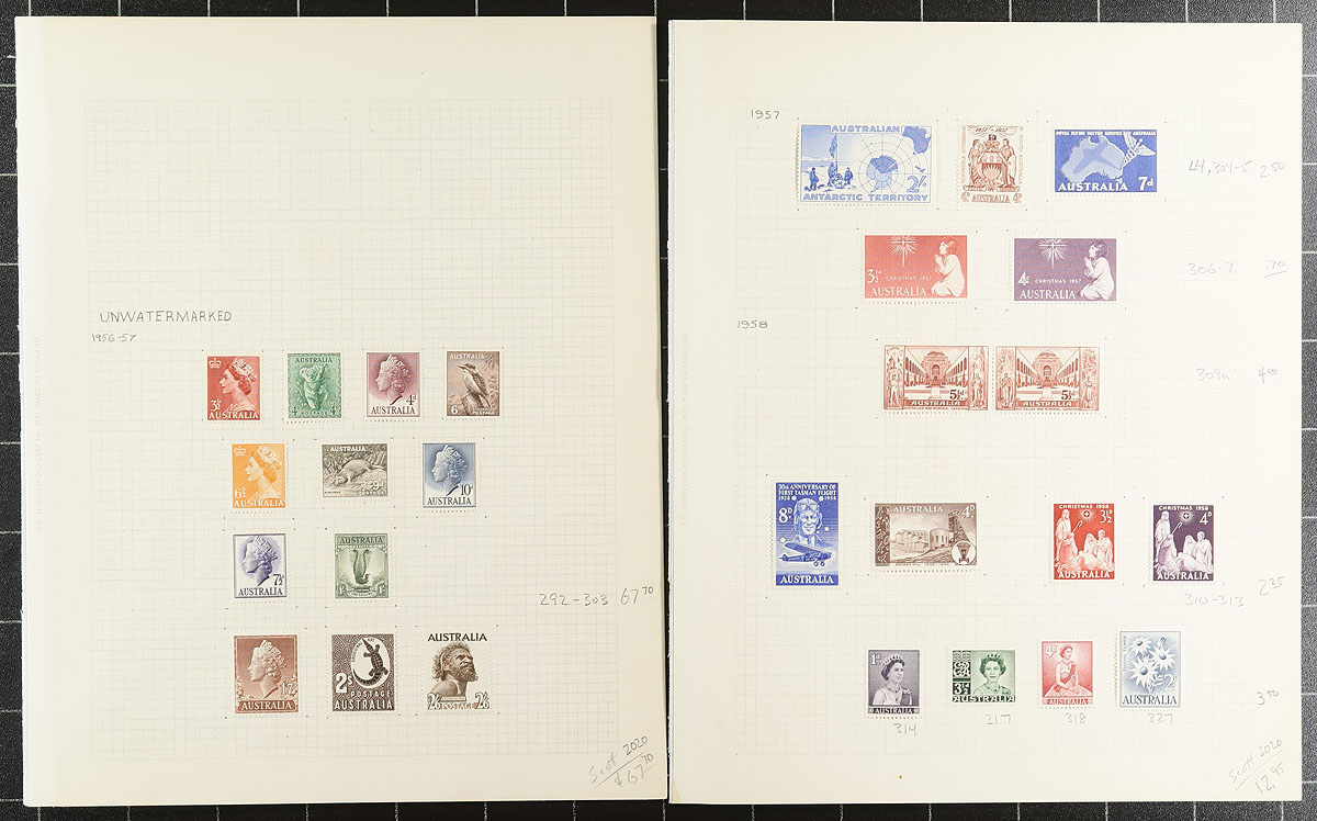 Mint Hinged and used 1937 to 1960 period collection of 168 different stamps, all hinged on the original album pages. Numerous complete sets, emergency coils, Australian Antarctic Territory and "Back of the Book" material. All identified and valued by 2020 Scott in pencil on each page. Owner's older 2020 Scott US$336.20 =