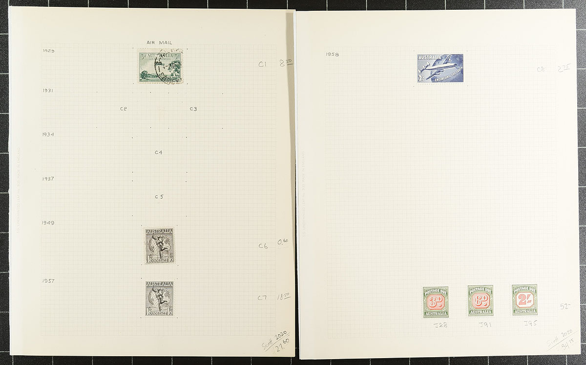 Mint Hinged and used 1937 to 1960 period collection of 168 different stamps, all hinged on the original album pages. Numerous complete sets, emergency coils, Australian Antarctic Territory and "Back of the Book" material. All identified and valued by 2020 Scott in pencil on each page. Owner's older 2020 Scott US$336.20 =