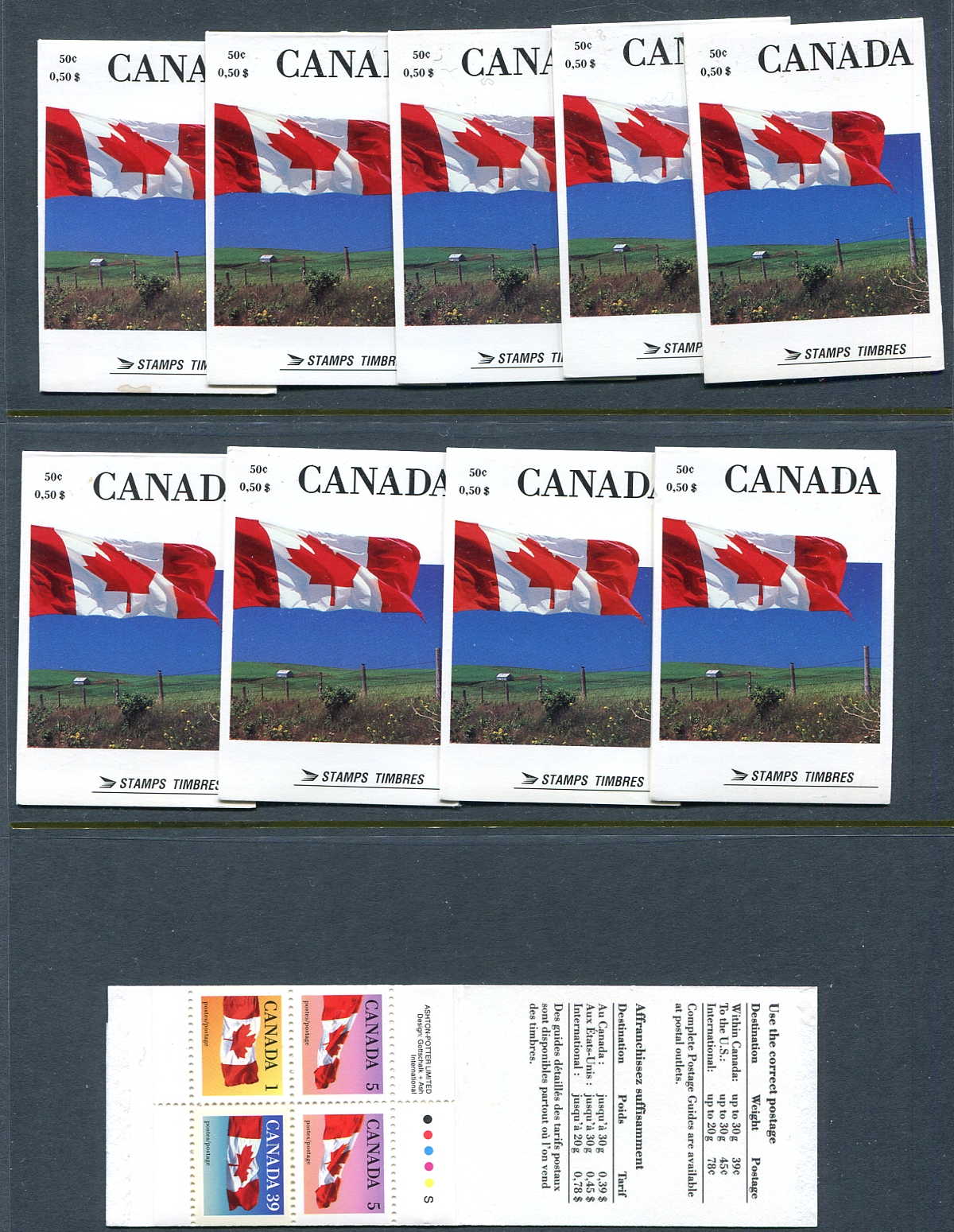 VF quality investment group of 10 intact examples of the scarce March 1990 issue 50c Flag booklet, all perf 12.5 x 13 (perf change). 2025-2026 Unitrade =
