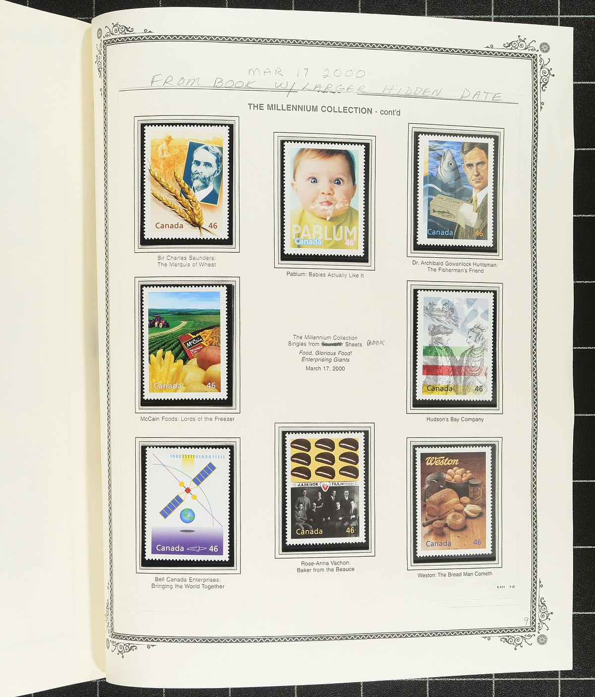 Complete VF mint Never Hinged set of all 64 different 1999 issue 46c "Millennium" commemorative stamps (removed from the hardcover Millennium book issued by the Post Office) plus a complete VF used set of 64 of the 2000 reprints. Both sets are not easy to find. 2025-2026 Unitrade =