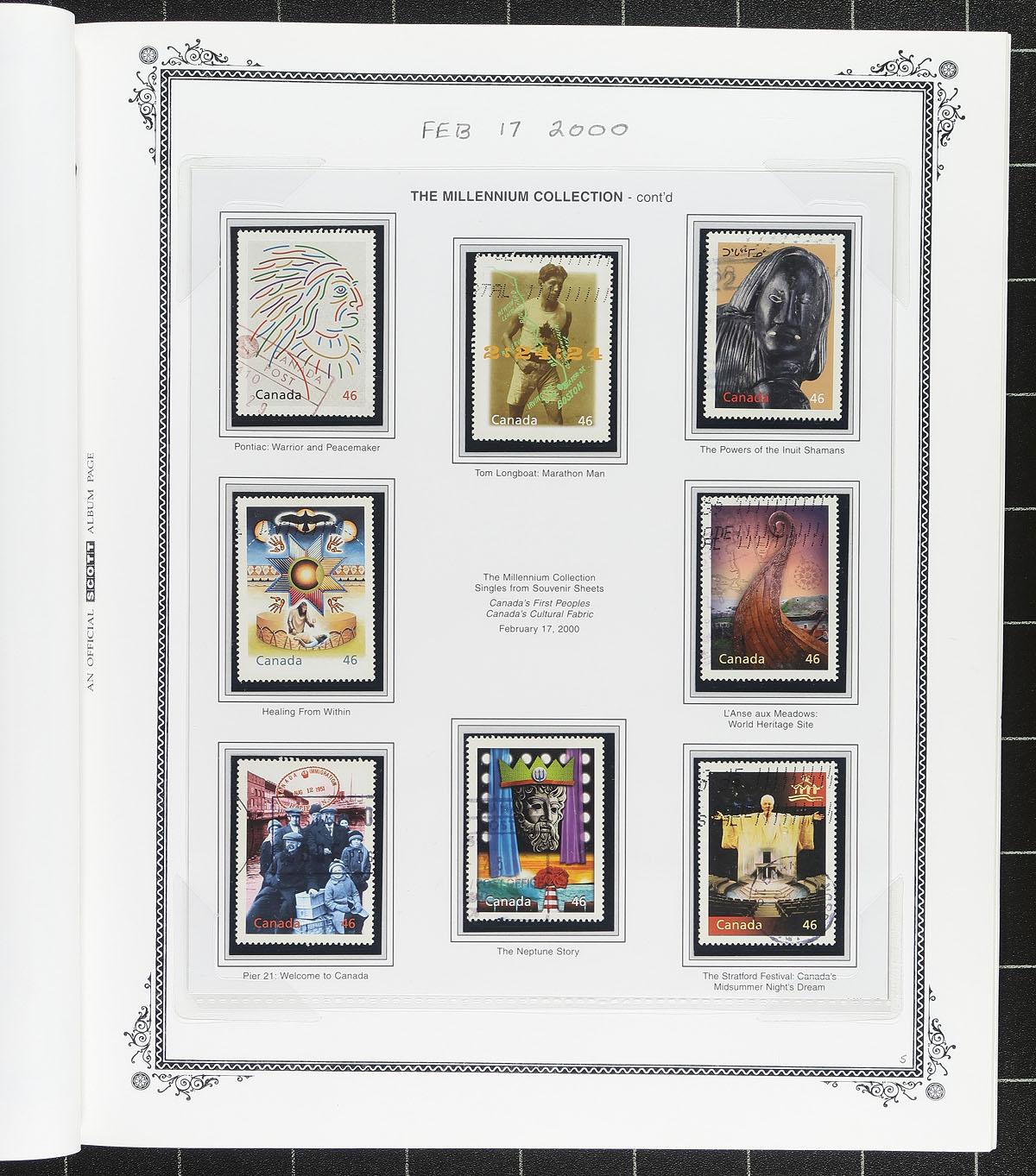 Complete VF mint Never Hinged set of all 64 different 1999 issue 46c "Millennium" commemorative stamps (removed from the hardcover Millennium book issued by the Post Office) plus a complete VF used set of 64 of the 2000 reprints. Both sets are not easy to find. 2025-2026 Unitrade =