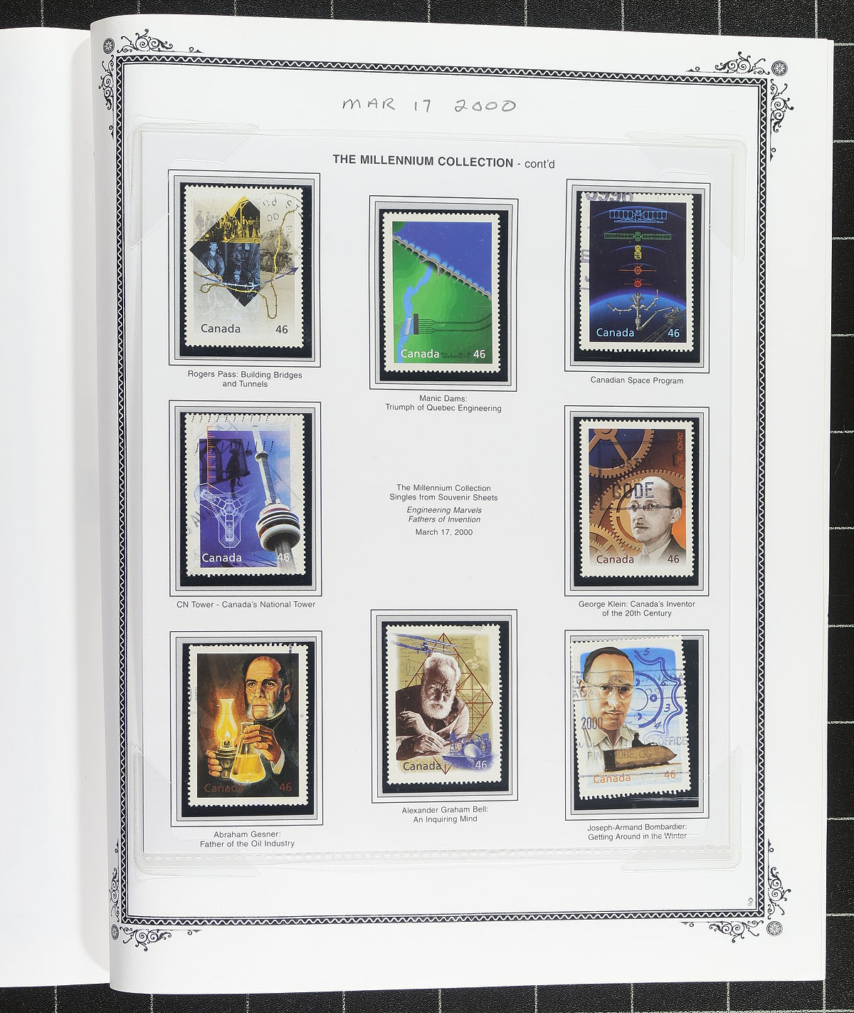 Complete VF mint Never Hinged set of all 64 different 1999 issue 46c "Millennium" commemorative stamps (removed from the hardcover Millennium book issued by the Post Office) plus a complete VF used set of 64 of the 2000 reprints. Both sets are not easy to find. 2025-2026 Unitrade =