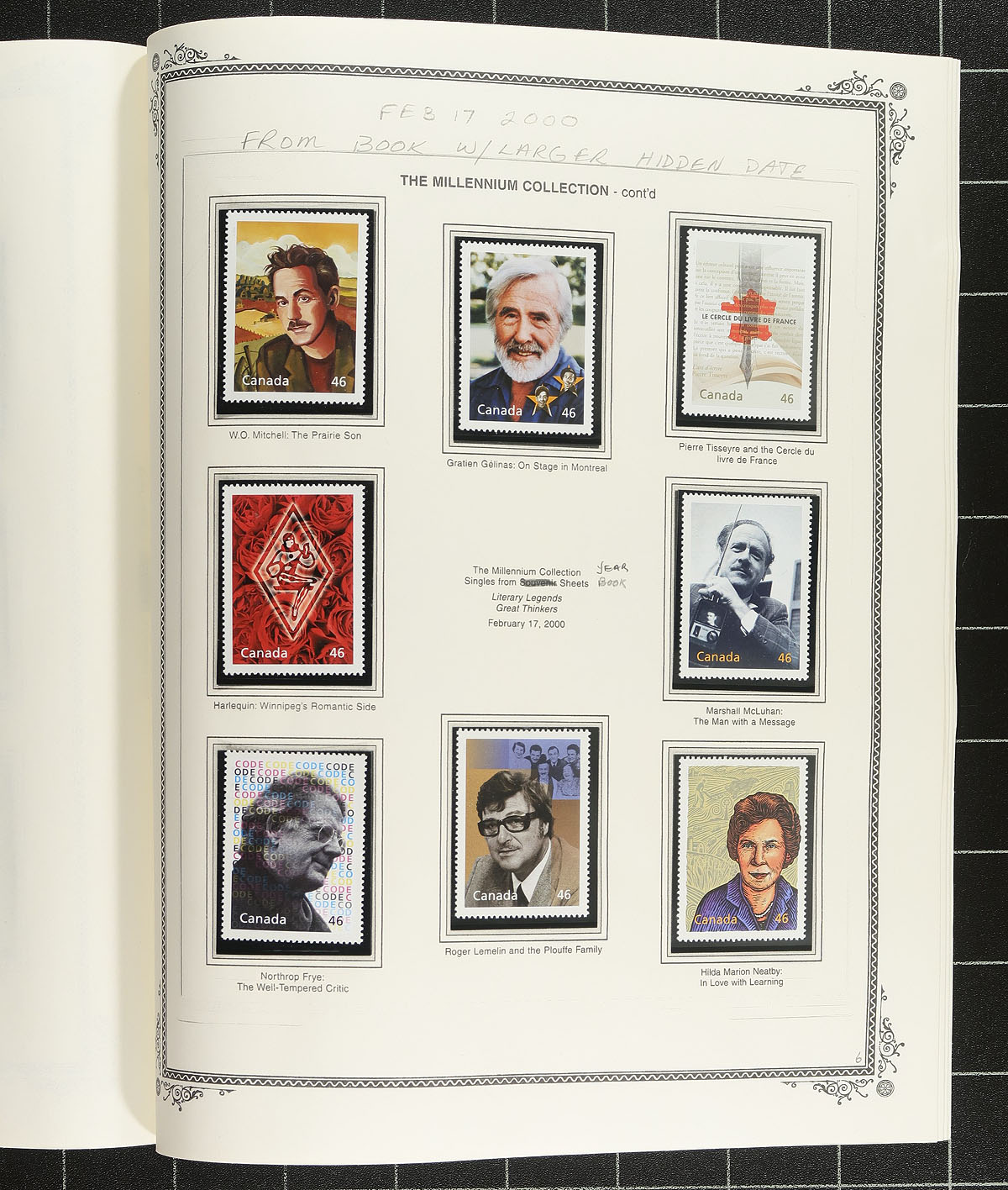 Complete VF mint Never Hinged set of all 64 different 1999 issue 46c "Millennium" commemorative stamps (removed from the hardcover Millennium book issued by the Post Office) plus a complete VF used set of 64 of the 2000 reprints. Both sets are not easy to find. 2025-2026 Unitrade =