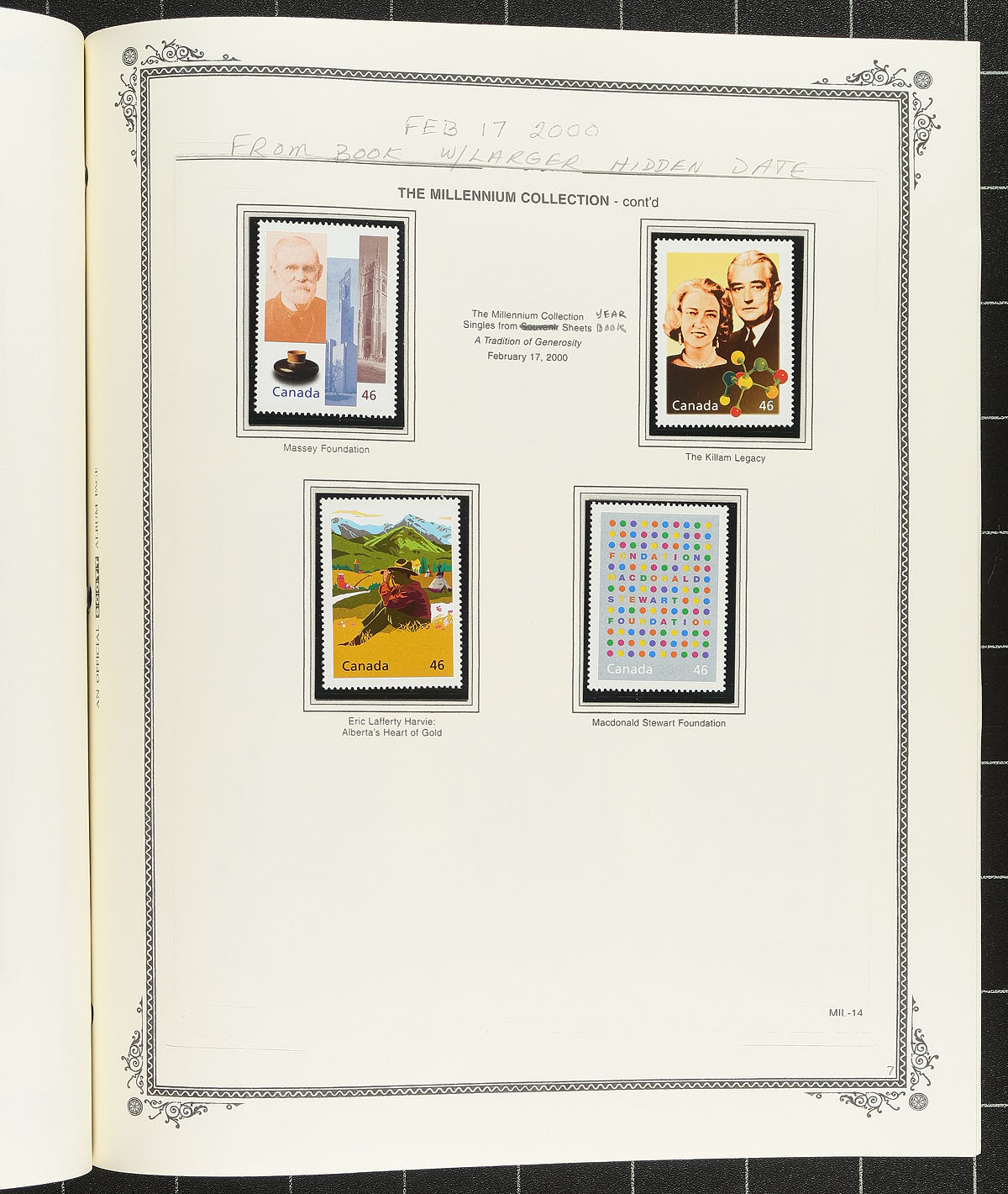 Complete VF mint Never Hinged set of all 64 different 1999 issue 46c "Millennium" commemorative stamps (removed from the hardcover Millennium book issued by the Post Office) plus a complete VF used set of 64 of the 2000 reprints. Both sets are not easy to find. 2025-2026 Unitrade =