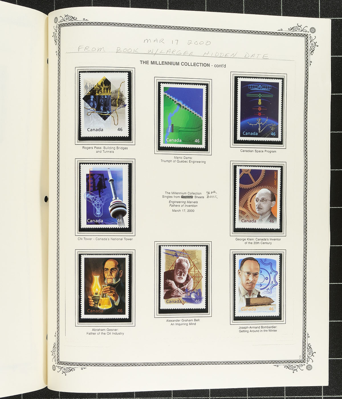 Complete VF mint Never Hinged set of all 64 different 1999 issue 46c "Millennium" commemorative stamps (removed from the hardcover Millennium book issued by the Post Office) plus a complete VF used set of 64 of the 2000 reprints. Both sets are not easy to find. 2025-2026 Unitrade =