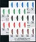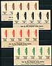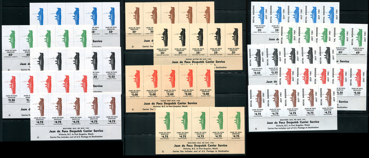 Juan da Fuca Dispatch Local Post. VF mint NH selection of 14 different 1980-1981 issue complete panes of five, including two complete sets of five different panes. The lot consists of Lafrenière catalogue Juan da Fuca Dispatch design "E" #48-49, 50-52 (30c, 35c, $2.00 and $4.75 face values, four of the five values on brown paper), #53-57 (complete set of five values, 35c, 65c, $2.25, $2.50 and $4.75 on white paper) and #58-62 (complete set of five values, 35c, 65c, $2.25, $2.50 and $4.75 on white paper overprinted "ROYAL WEDDING JULY 1981"). The unoverprinted "E" types are very hard to find. Estimate =