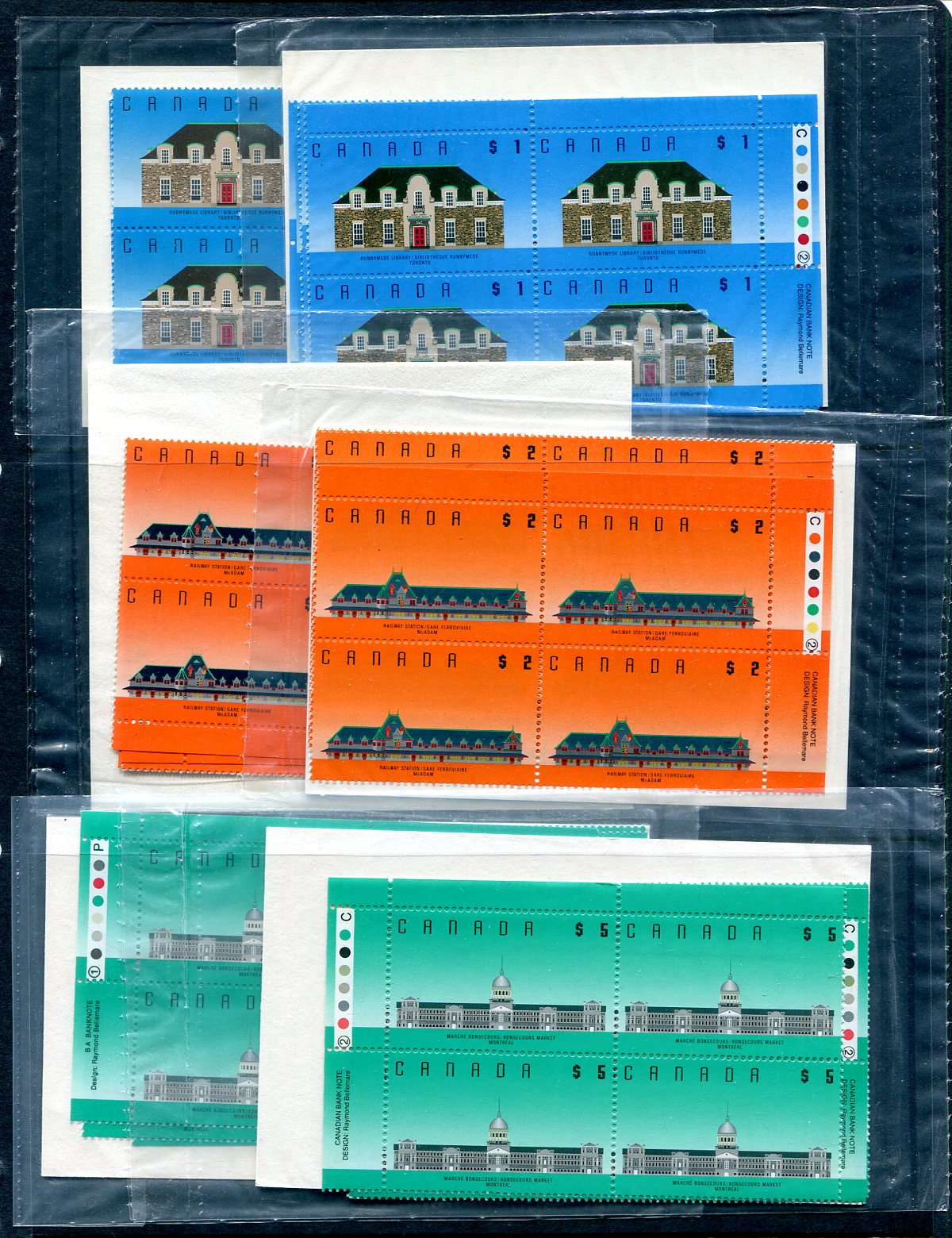 VF mint Never Hinged matched set of inscription blocks (still in the P.O. sealed plastic) representing both Plate #1 (BA Bank Note Co) and Plate #2 (Canadian Bank Note) printings of the $1.00 Runnymede, $2.00 McAdam Railway Station and $5.00 Bonsecours Market of the 1989-1992 Architecture high-value definitives. This is the first time we have offered all 6 P.O. pack at once. Face value alone is $256.00. 2025-2026 Unitrade =