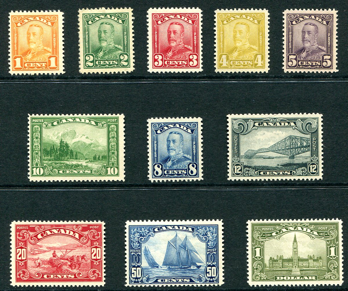 F/VF mint Hinged (mostly lightly) complete set of the 1928-1929 George V "Scroll" issue, including both the iconic 50c Bluenose and $1.00 Parliament (both Lightly Hinged). A lovely set. 2025 Scott US$743.15 =
