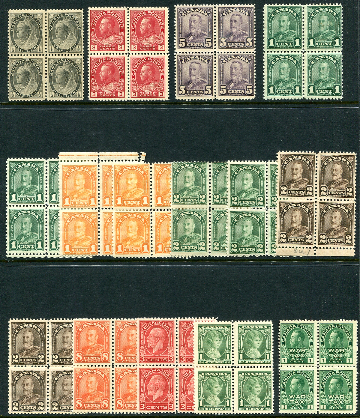 Fine+ group of 15 mint blocks from the QV to George V era, generally Lightly Hinged on top, Never Hinged on bottom. Includes examples of the 1/2c QV Numeral, 3c carmine Admiral, 5c George V Scroll, 8c George V Leaf and MR1 Admiral War Tax (to name a few). All conservatively valued as hinged. 2025 Scott US$396.20 =
