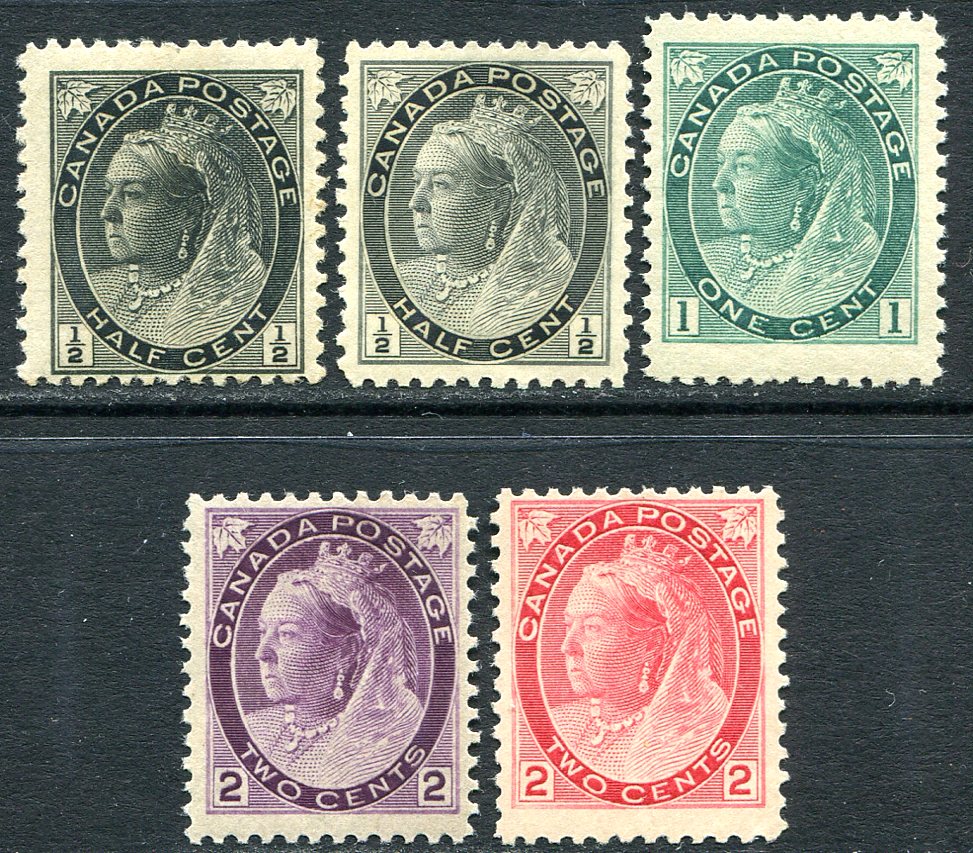 Fine mint Never Hinged selection of five 1898-1902 QV Numeral issues, including the 1/2c black, 1c grey green, 2c purple and 2c carmine. Complimented with an additional example of the 1/2c value in Unitrade listed grey shade (not listed in Scott, valued as basic stamp). 2025 Scott US$360.00 =