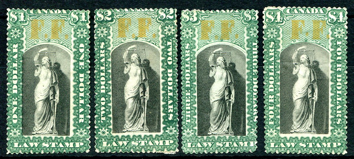 Fine mint Hinged / Hinge Remnant group of four different 1864 issued Province of Ontario Law Stamps (p&s sub-type), overprinted "F.F." (Fee Fund). Includes the $1.00 / $2.00 / $3.00 / $4.00 values, all in fair condition considering age, with small hinge thin on the top of the $1.00 value (mentioned for the record). 2022 van Dam =
