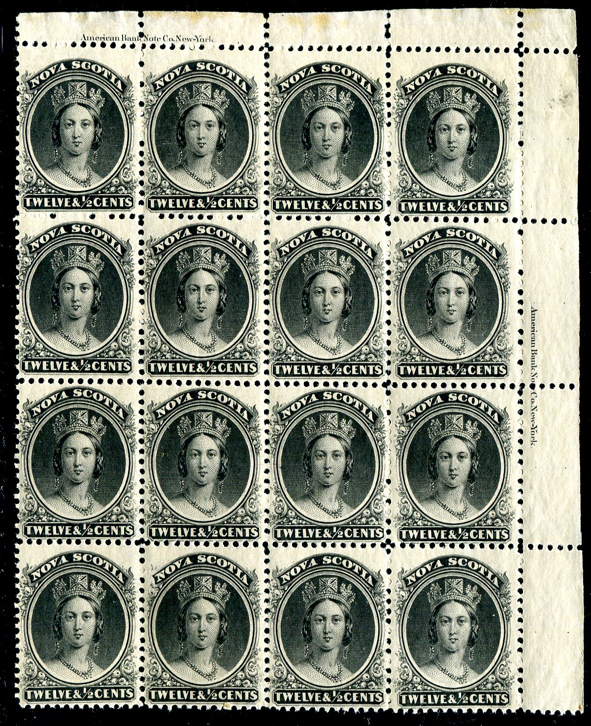 Fine mint Never Hinged upper-left corner, sheet margin block of 16 with double "American Bank Note Co. New York" inscription on both the top and left. Valued as 16x NH singles, but certainly worth more as an inscription piece. 2025 Scott US$1,280.00 =