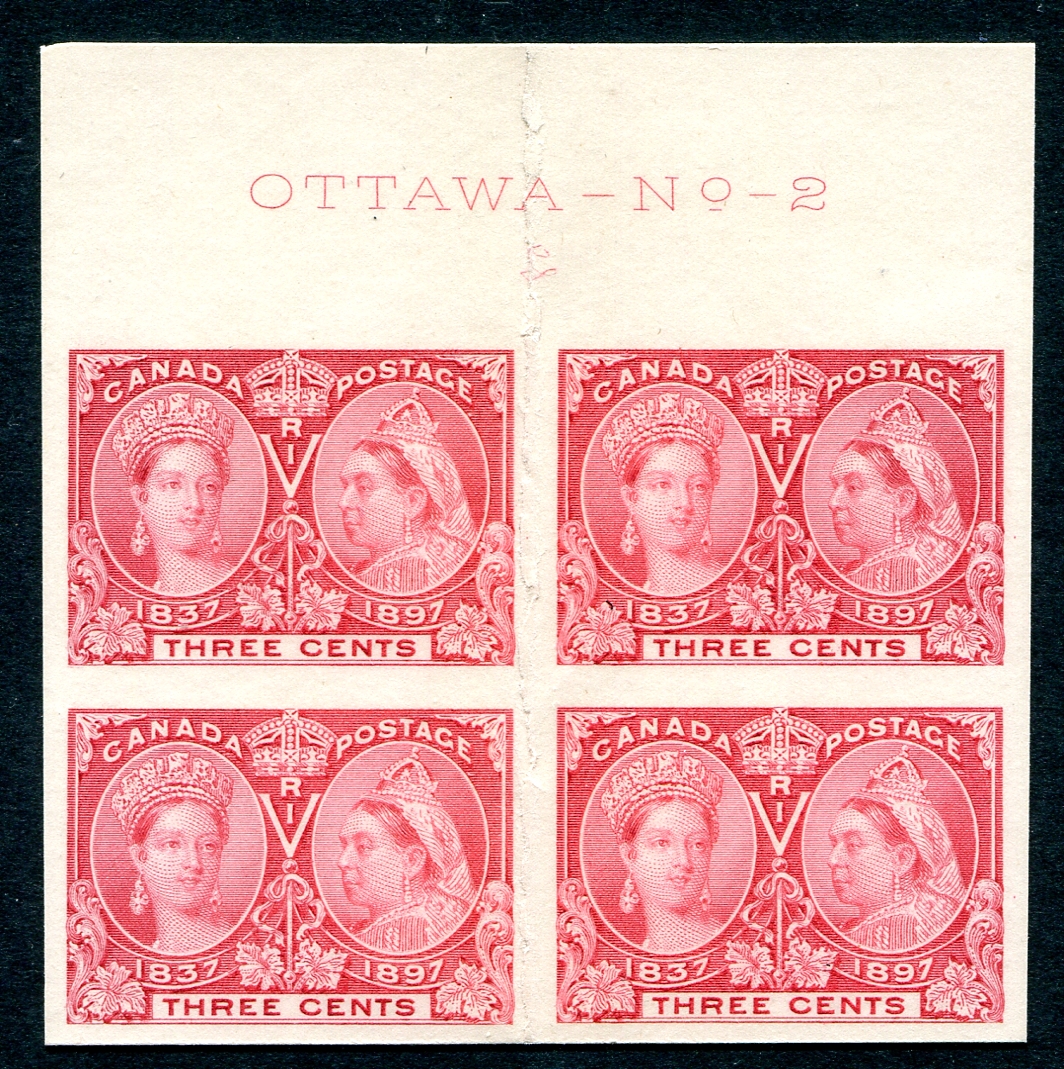 VF example of the 1897 QV Jubilee 3c bright rose Plate Proof on india paper, mounted on card, in upper sheet-margin block of four, with full "OTTAWA - No. 2" inscription in selvedge. There is a vertical crease between the stamps, from when these sheets were stored before auctioned in the 1990 American Bank Note Company archive sale, this the only way to get this inscription block is with vertical crease. The basic catalogue value for 4x singles is $200.00, with Unitrade noting that inscription blocks (on regular stamps) are "scarce". Estimate =