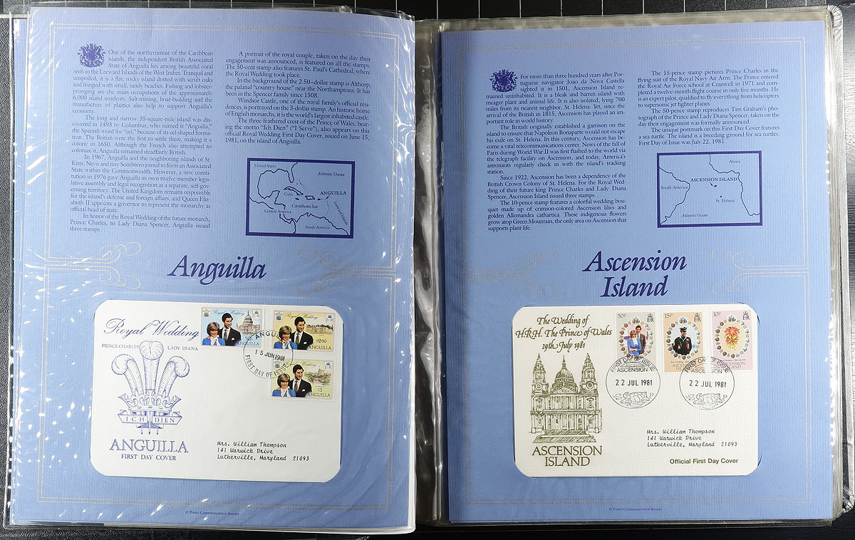 1981 Charles and Diana "Royal Wedding First Day Cover Collection" prepared by the Postal Commemorative Society. 71 different cacheted covers, all housed in a deluxe large format album. Huge original cost. Valued by the owner over two decades ago. Owner's 1996 Scott catalogue value as used stamps only US$225.24 = $304.10 CDN. Estimate =