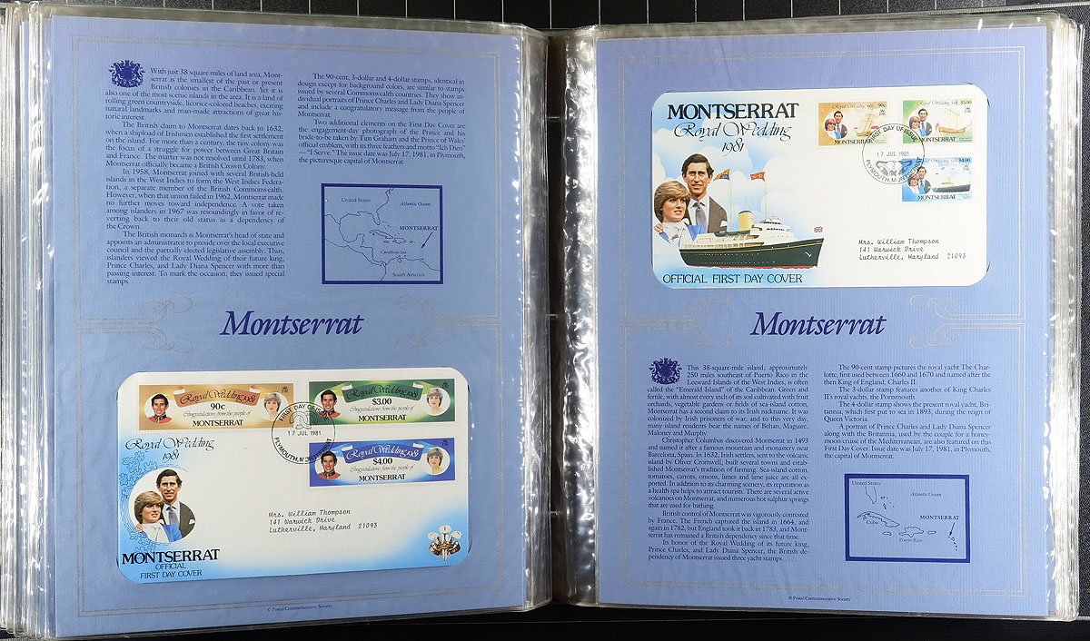 1981 Charles and Diana "Royal Wedding First Day Cover Collection" prepared by the Postal Commemorative Society. 71 different cacheted covers, all housed in a deluxe large format album. Huge original cost. Valued by the owner over two decades ago. Owner's 1996 Scott catalogue value as used stamps only US$225.24 = $304.10 CDN. Estimate =