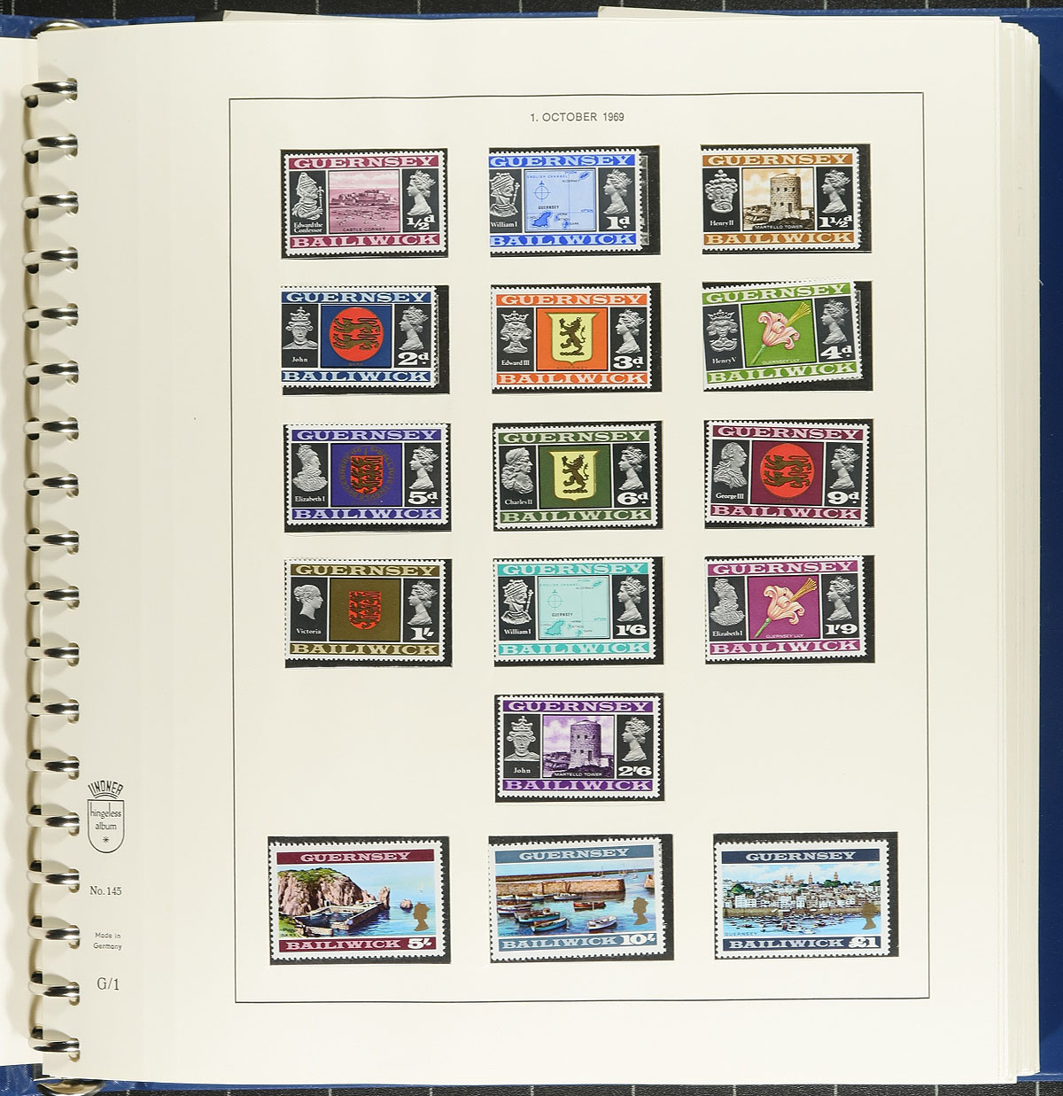 About as complete a mint collection of Guernsey that you can find, in a Lindner hingeless album with pages from 1969-1988 in a matching blue slipcase. A total of 433 stamps, includes a complete run of postage dues and 31 souvenir sheets with a bonus of 11 first day covers. Missing booklet panes and the 2 different perforation varieties on the first 10/- and £1 definitives, but otherwise largely complete. A few of the early stamps are Hinged, but the vast majority are Never Hinged and overall the condition is excellent. Total 2023 Scott catalogue value US$386.75, with a face value of the decimal era stamps at £135.53 and an album with a retail value of over $200.00. Estimate =