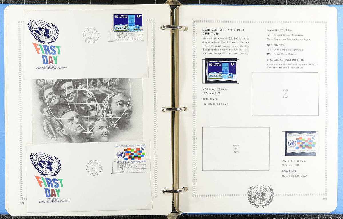 A box of UN odds n’ ends, including three separate mounted collections and a fourth which someone stripped the stamps in mounts and tossed the album. There are a number of cacheted First Day Covers, a few year sets, glassines with up to blocks of 10, folders, brochures and a few non-FDC covers. Appears to be up to 1980, so it is mostly New York issues. Estimate =