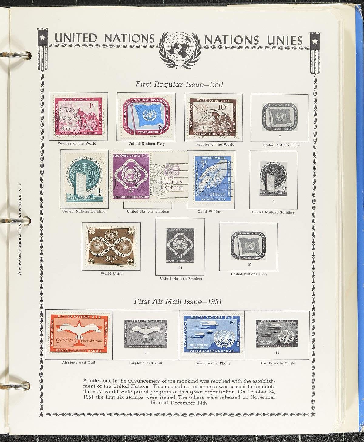 A box of UN odds n’ ends, including three separate mounted collections and a fourth which someone stripped the stamps in mounts and tossed the album. There are a number of cacheted First Day Covers, a few year sets, glassines with up to blocks of 10, folders, brochures and a few non-FDC covers. Appears to be up to 1980, so it is mostly New York issues. Estimate =