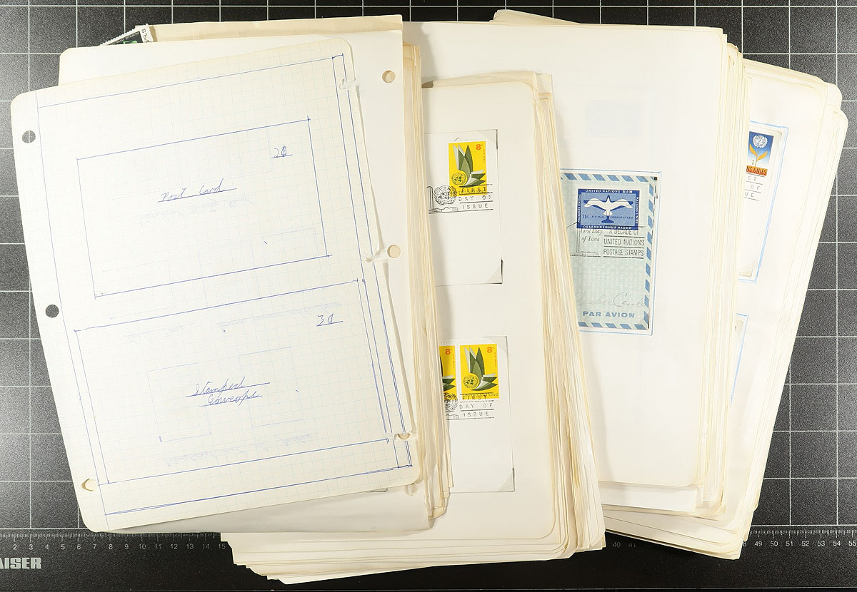 A box of UN odds n’ ends, including three separate mounted collections and a fourth which someone stripped the stamps in mounts and tossed the album. There are a number of cacheted First Day Covers, a few year sets, glassines with up to blocks of 10, folders, brochures and a few non-FDC covers. Appears to be up to 1980, so it is mostly New York issues. Estimate =