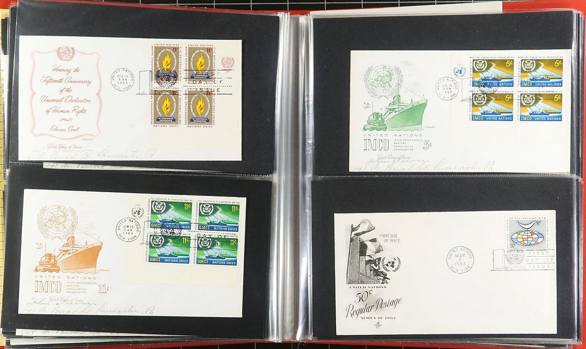 A box of UN odds n’ ends, including three separate mounted collections and a fourth which someone stripped the stamps in mounts and tossed the album. There are a number of cacheted First Day Covers, a few year sets, glassines with up to blocks of 10, folders, brochures and a few non-FDC covers. Appears to be up to 1980, so it is mostly New York issues. Estimate =