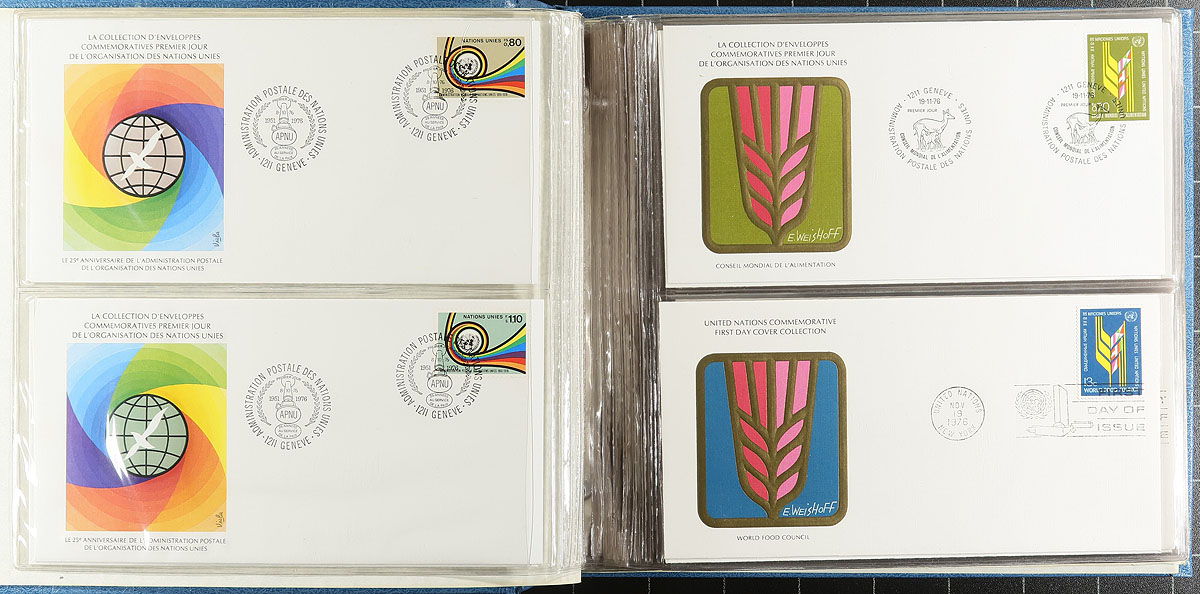 A box of UN odds n’ ends, including three separate mounted collections and a fourth which someone stripped the stamps in mounts and tossed the album. There are a number of cacheted First Day Covers, a few year sets, glassines with up to blocks of 10, folders, brochures and a few non-FDC covers. Appears to be up to 1980, so it is mostly New York issues. Estimate =