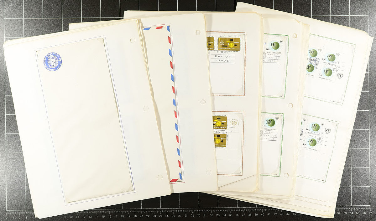 A box of UN odds n’ ends, including three separate mounted collections and a fourth which someone stripped the stamps in mounts and tossed the album. There are a number of cacheted First Day Covers, a few year sets, glassines with up to blocks of 10, folders, brochures and a few non-FDC covers. Appears to be up to 1980, so it is mostly New York issues. Estimate =
