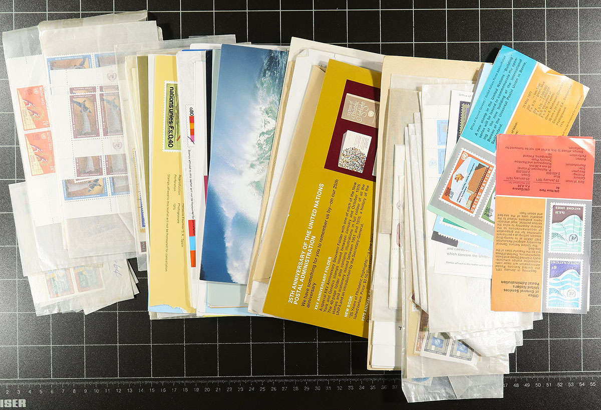 A box of UN odds n’ ends, including three separate mounted collections and a fourth which someone stripped the stamps in mounts and tossed the album. There are a number of cacheted First Day Covers, a few year sets, glassines with up to blocks of 10, folders, brochures and a few non-FDC covers. Appears to be up to 1980, so it is mostly New York issues. Estimate =
