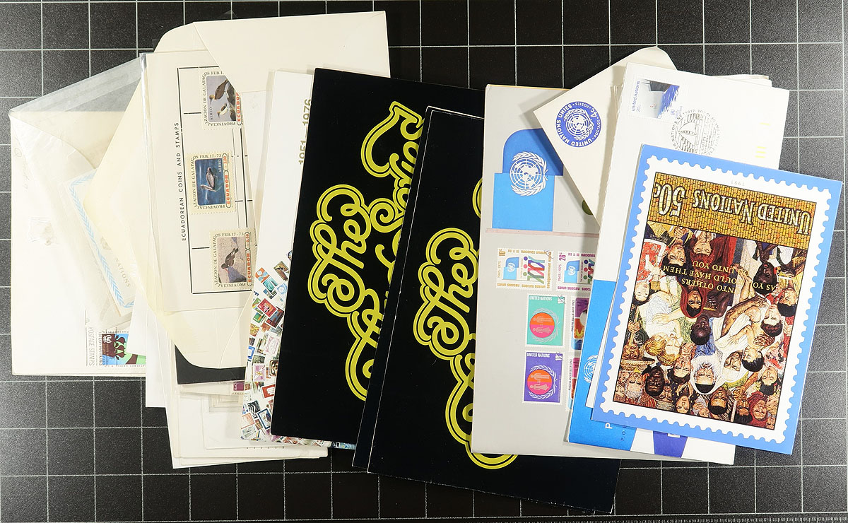 A box of UN odds n’ ends, including three separate mounted collections and a fourth which someone stripped the stamps in mounts and tossed the album. There are a number of cacheted First Day Covers, a few year sets, glassines with up to blocks of 10, folders, brochures and a few non-FDC covers. Appears to be up to 1980, so it is mostly New York issues. Estimate =