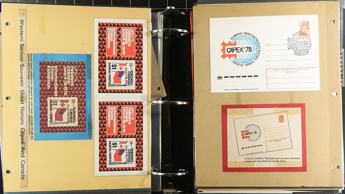 Mini-hoard of Philatelic Exhibition issues, covers, cancels and ephemera. Overwhelming strength is for 1978 CAPEX held in Toronto, with stamps, first day covers (including a number of different cachets), supporting material from other postal administrations (including in the year’s leading up to the show). There are programs, catalogues, a couple of sets of the show souvenirs, even newspaper clippings. While there is a set of CAPEX ’51 labels, the balance of the lot is mostly Canadian show material from the 1970’s-1980’s including CAPEX ’87, and a series of National, even regional show material. There is a touch of cards and souvenir sheets for American and British shows. This lot was upended at some point and needs some organizing. Estimate =