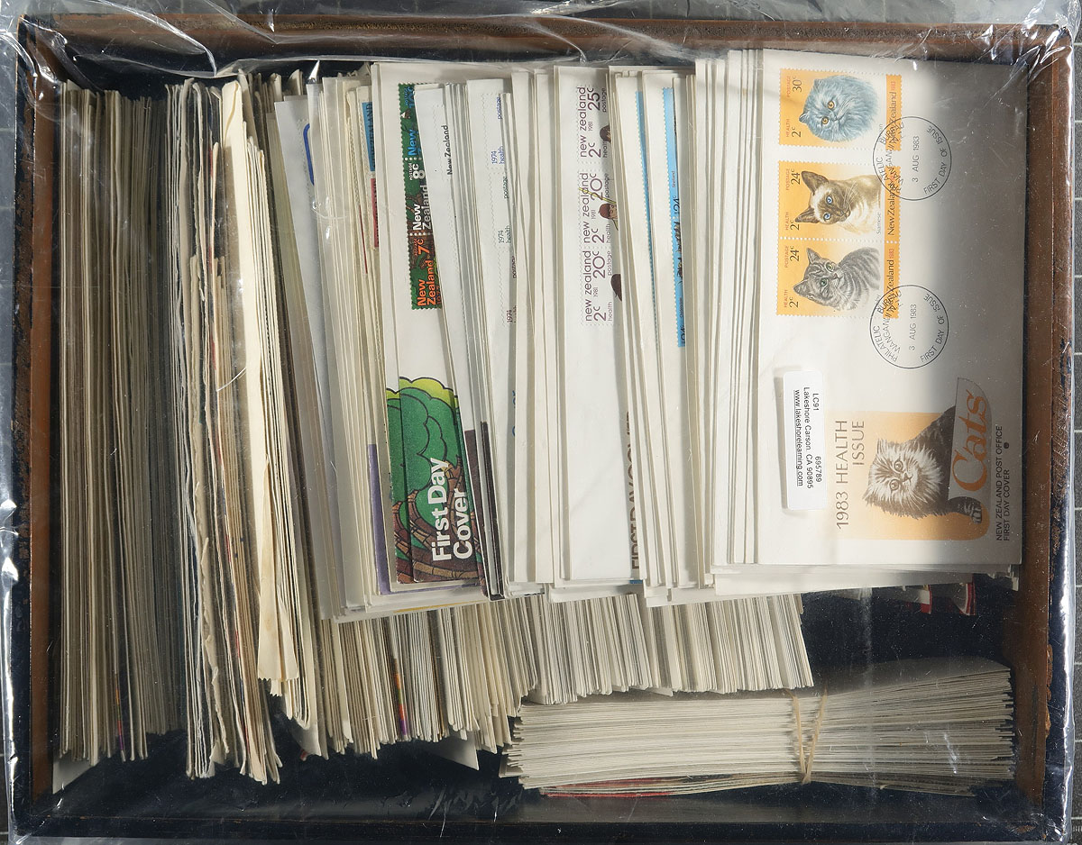 Bankers Box, containing a "box and binder" duo lot. The box has about 275 illustrated cachet First Day covers, covering 1960’s-2002, with strength in the 1990’s with individual items to NZ$20.00 face value (noted 2x Cook souvenir sheet FDC with different illustrated cachets). Mixed in with these FDCs are some new issues, as received from the Post Office, mostly 1999-2002 with about NZ$75.00 face value. The binder has mint Health souvenir sheets B52a/B117a (up to 1986) very complete (most hinged) these catalogue US$410.00 ($553.50 CDN) alone! Estimate =