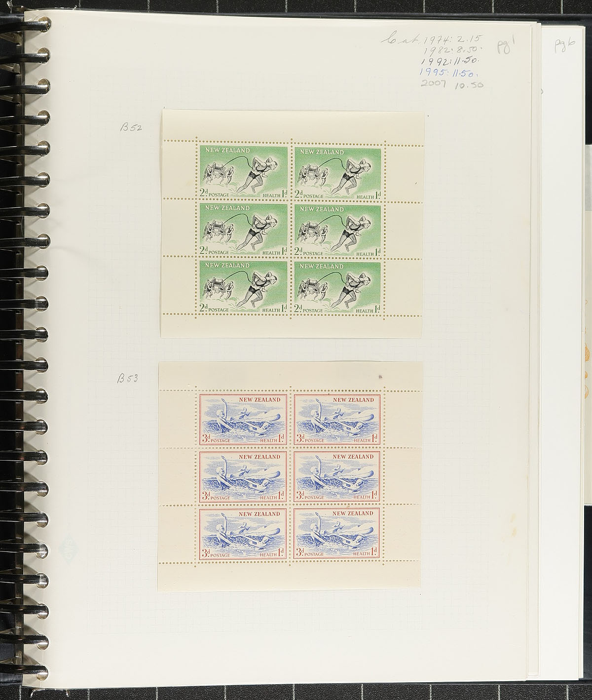 Bankers Box, containing a "box and binder" duo lot. The box has about 275 illustrated cachet First Day covers, covering 1960’s-2002, with strength in the 1990’s with individual items to NZ$20.00 face value (noted 2x Cook souvenir sheet FDC with different illustrated cachets). Mixed in with these FDCs are some new issues, as received from the Post Office, mostly 1999-2002 with about NZ$75.00 face value. The binder has mint Health souvenir sheets B52a/B117a (up to 1986) very complete (most hinged) these catalogue US$410.00 ($553.50 CDN) alone! Estimate =