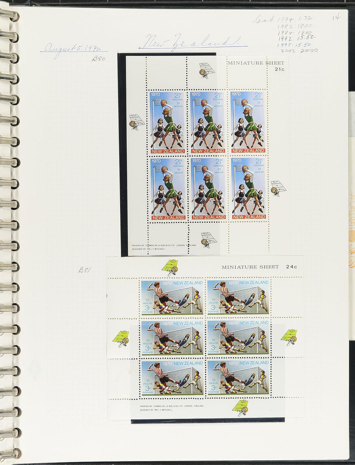 Bankers Box, containing a "box and binder" duo lot. The box has about 275 illustrated cachet First Day covers, covering 1960’s-2002, with strength in the 1990’s with individual items to NZ$20.00 face value (noted 2x Cook souvenir sheet FDC with different illustrated cachets). Mixed in with these FDCs are some new issues, as received from the Post Office, mostly 1999-2002 with about NZ$75.00 face value. The binder has mint Health souvenir sheets B52a/B117a (up to 1986) very complete (most hinged) these catalogue US$410.00 ($553.50 CDN) alone! Estimate =