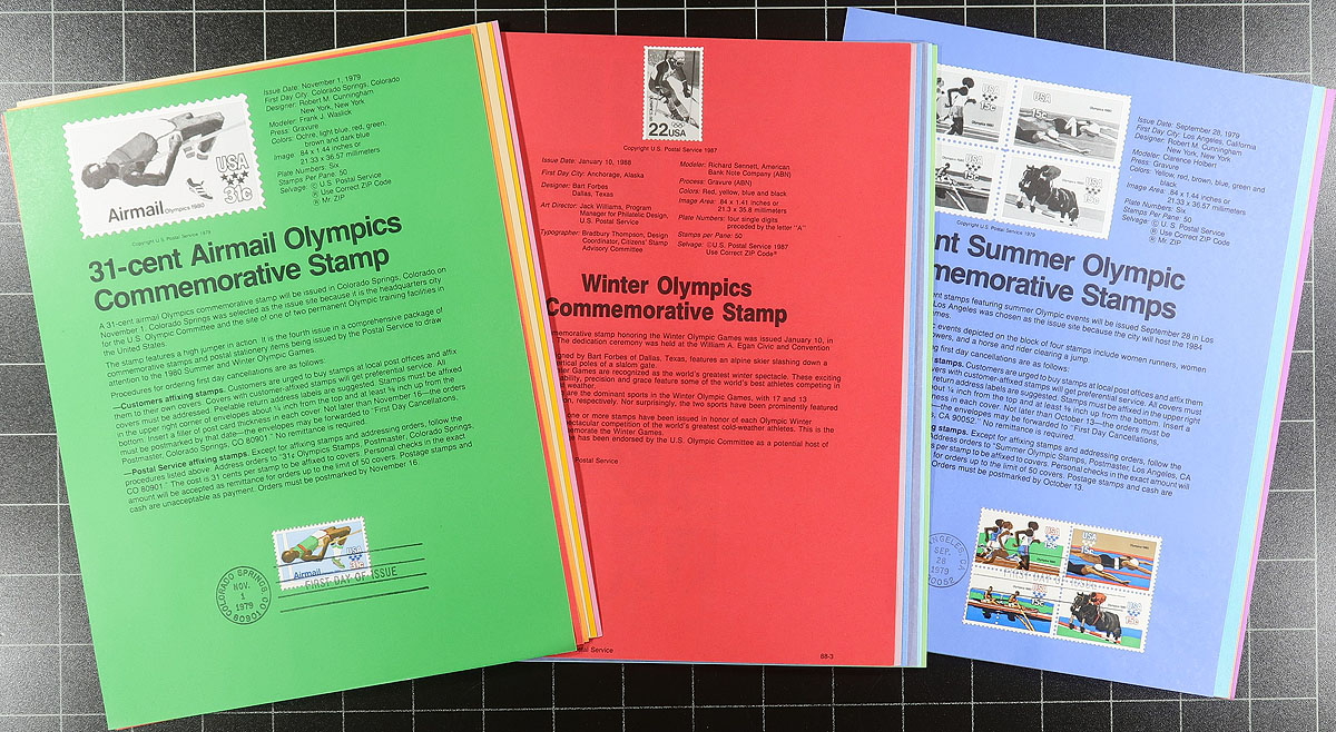 Commemorative Panels, a form of first day cover, but on a single page with stamp / first day cancel and a lengthy description about the issue. This group is 400 panels issued between 1977-1992 includes commemoratives, definitives, coils, booklet panes, airmails and officials. The collector organized these by subject, not chronologically, with one of the shortcomings of this method is that we don’t know how complete this run is. The overall condition is excellent, although someone hole punched about 20 of them to fit into binders, the rest are as issued. Listed in Scott US Specialized catalogue at between $1.50-$5.00 each. Great for topical collectors or as a way to expand your American First Day of Issue collection. Estimate =