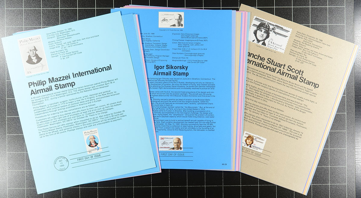 Commemorative Panels, a form of first day cover, but on a single page with stamp / first day cancel and a lengthy description about the issue. This group is 400 panels issued between 1977-1992 includes commemoratives, definitives, coils, booklet panes, airmails and officials. The collector organized these by subject, not chronologically, with one of the shortcomings of this method is that we don’t know how complete this run is. The overall condition is excellent, although someone hole punched about 20 of them to fit into binders, the rest are as issued. Listed in Scott US Specialized catalogue at between $1.50-$5.00 each. Great for topical collectors or as a way to expand your American First Day of Issue collection. Estimate =