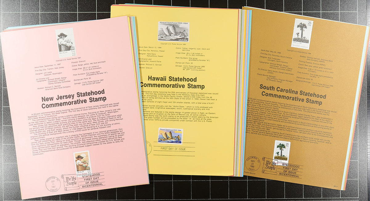 Commemorative Panels, a form of first day cover, but on a single page with stamp / first day cancel and a lengthy description about the issue. This group is 400 panels issued between 1977-1992 includes commemoratives, definitives, coils, booklet panes, airmails and officials. The collector organized these by subject, not chronologically, with one of the shortcomings of this method is that we don’t know how complete this run is. The overall condition is excellent, although someone hole punched about 20 of them to fit into binders, the rest are as issued. Listed in Scott US Specialized catalogue at between $1.50-$5.00 each. Great for topical collectors or as a way to expand your American First Day of Issue collection. Estimate =