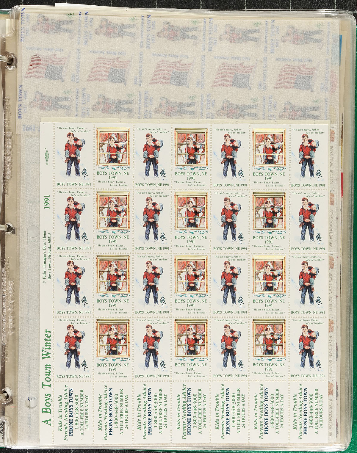 ESTATE HOARD. Bankers Box, filled with a cinderellas, labels, charity stamps, poster stamp HOARD. Mostly American, but with some Canadian (including French language) and even a Danish sheet. There are Christmas, Easter, BoysTown/Omaha/Starr Home for Boys, Wildlife Federation, Philatelic (noted a PIPEX ’49 complete sheet in the original envelope), CAPEX ’96 and Pacific ’97, Veterans of Foreign Wars, St. Jude’s Children’s Hospital, religious (including a promo letter "signed" by Roy Rogers and Dale Evans), a single "Columbia Coast Mission" seal and more. Most are complete panes or large blocks, filling three bursting binders and a DOZEN mint sheet files, plus some loose material. Besides the overwhelming quantity of seals, there is lots of supporting material, such as promotional letters, sleeves/packaging which adds to this lot. The range of years looks to be 1910-1999. Seldom offered in such quantity! Estimate =