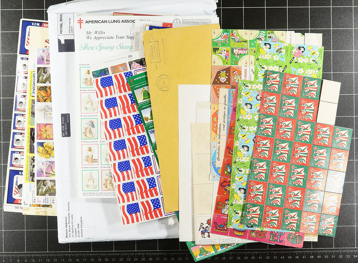 ESTATE HOARD. Bankers Box, filled with a cinderellas, labels, charity stamps, poster stamp HOARD. Mostly American, but with some Canadian (including French language) and even a Danish sheet. There are Christmas, Easter, BoysTown/Omaha/Starr Home for Boys, Wildlife Federation, Philatelic (noted a PIPEX ’49 complete sheet in the original envelope), CAPEX ’96 and Pacific ’97, Veterans of Foreign Wars, St. Jude’s Children’s Hospital, religious (including a promo letter "signed" by Roy Rogers and Dale Evans), a single "Columbia Coast Mission" seal and more. Most are complete panes or large blocks, filling three bursting binders and a DOZEN mint sheet files, plus some loose material. Besides the overwhelming quantity of seals, there is lots of supporting material, such as promotional letters, sleeves/packaging which adds to this lot. The range of years looks to be 1910-1999. Seldom offered in such quantity! Estimate =