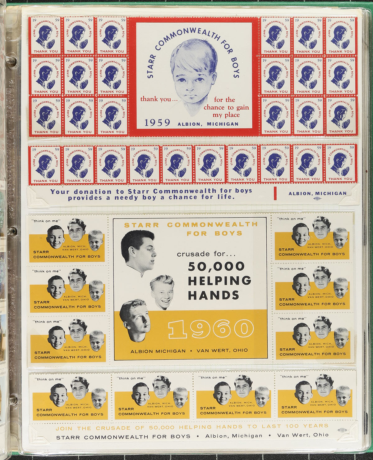 ESTATE HOARD. Bankers Box, filled with a cinderellas, labels, charity stamps, poster stamp HOARD. Mostly American, but with some Canadian (including French language) and even a Danish sheet. There are Christmas, Easter, BoysTown/Omaha/Starr Home for Boys, Wildlife Federation, Philatelic (noted a PIPEX ’49 complete sheet in the original envelope), CAPEX ’96 and Pacific ’97, Veterans of Foreign Wars, St. Jude’s Children’s Hospital, religious (including a promo letter "signed" by Roy Rogers and Dale Evans), a single "Columbia Coast Mission" seal and more. Most are complete panes or large blocks, filling three bursting binders and a DOZEN mint sheet files, plus some loose material. Besides the overwhelming quantity of seals, there is lots of supporting material, such as promotional letters, sleeves/packaging which adds to this lot. The range of years looks to be 1910-1999. Seldom offered in such quantity! Estimate =