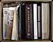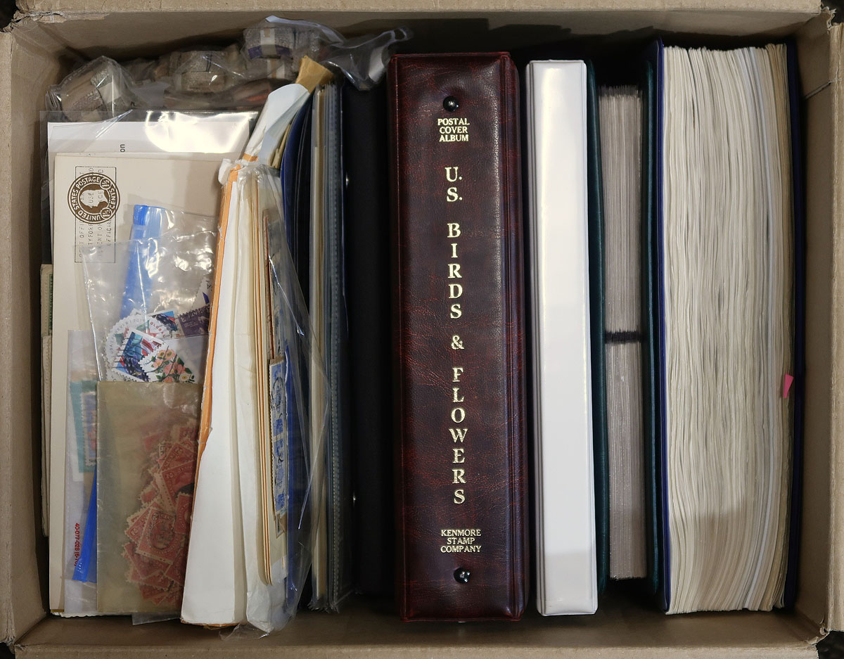 Bankers box crammed with a range of US material including three binders with stamps, blocks and cancels. Noted a couple hundred uncacheted FDCs and cacheted event covers from the 1950’s-1970’s, including a binder with about 25 Hummel Christmas themed covers, with winter or Christmas themed cancels on nice cachets (original cost would have been significant). While most of the stamps are used, we did notice about US$40.00 of modern postage from the 33c era. Every remaining space in the box is filled with envelopes and baggies filled with stamps. Estimate =